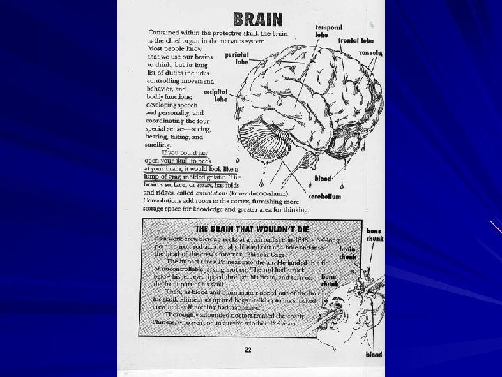 A. Central Nervous System 1. Brain § 3 lb. organ, uses 20% of body’s oxygen § 100 billion neurons §protected by skull, meninges (tough membrane) and cerebrospinal fluid (CSF) §Composed of 2 sides called hemispheres § 3 major parts: a. cerebrum • largest part • right hemisphere controls the left side of the body & vice-versa • the 2 hemispheres communicate via the nerves of the corpus callossum • is convoluted (folded) to increase surface area for information storage