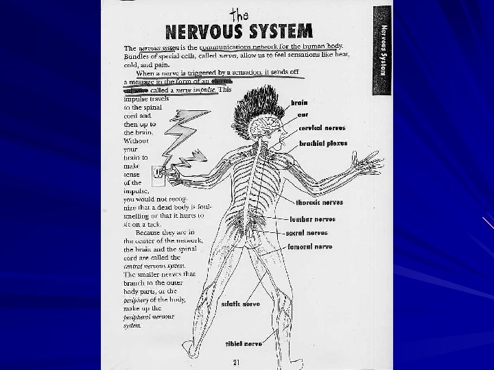 c. receptor- structures that detect stimuli ex) sense organs d. response- reaction to a stimulus carried out by the effectors organs of response include muscles & glands e. effectorf. neuron- nerve cell, functional unit of nervous system a bundle of neurons is a nerve Parts of a neuron: 1. dendrites- fibers that detect stimuli generate impulse toward cyton 2. cyton- “cell body” contains nucleus 3. axon- fibers that send impulse away from cyton to terminal branches