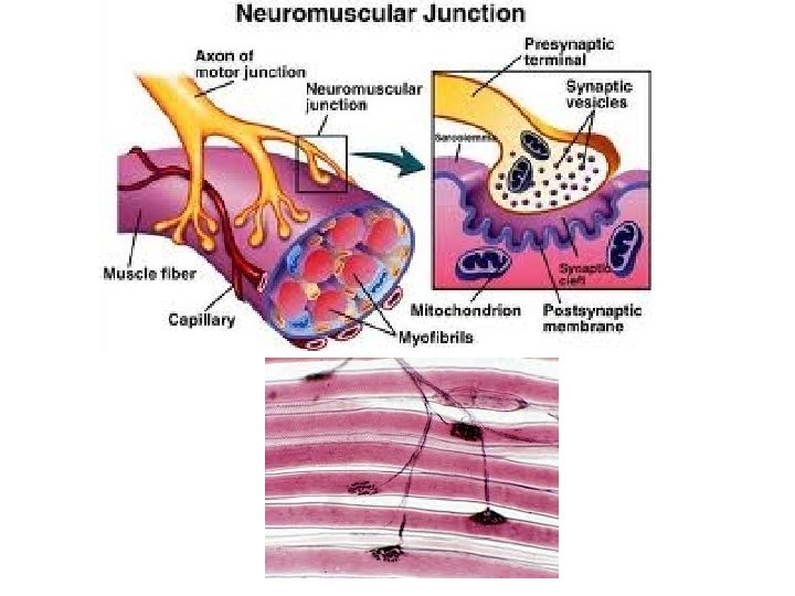 The Neuromuscular Junction • Synaptic point of contact between motor neurons and muscle cells • Motor neurons end in “motor end plates” that release the neurotransmitter acetylcholine • These molecules bind with receptors in membrane of muscle cells causing them to contract.