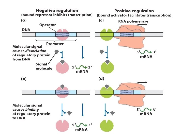 Potential Points of Regulation • Synthesis of primary RNA transcript (transcription) • Posttranscriptional modification of m. RNA • m. RNA degradation • Protein synthesis (translation) • Posttranslational modification of proteins • Protein targeting and transport • Protein degradation