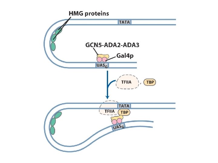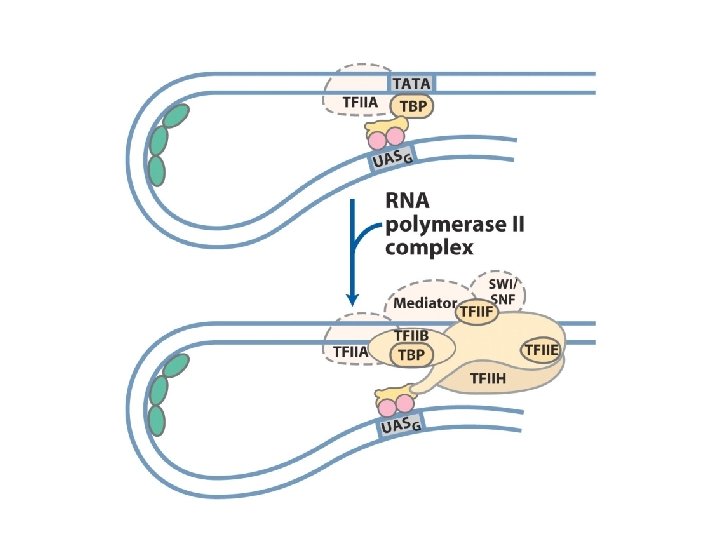 Many eukaryotic promoters are positively regulated • RNA polymerases have little or no intrinsic affinity for promoters • Transcription initiation depends on activator proteins • Enhancer; Upstream Activator Sequence (UAS, Yeast) • Basal transcription factors – RNA pol II DNA-binding transactivator – enhancer Coactivator – interconnections Repressors -