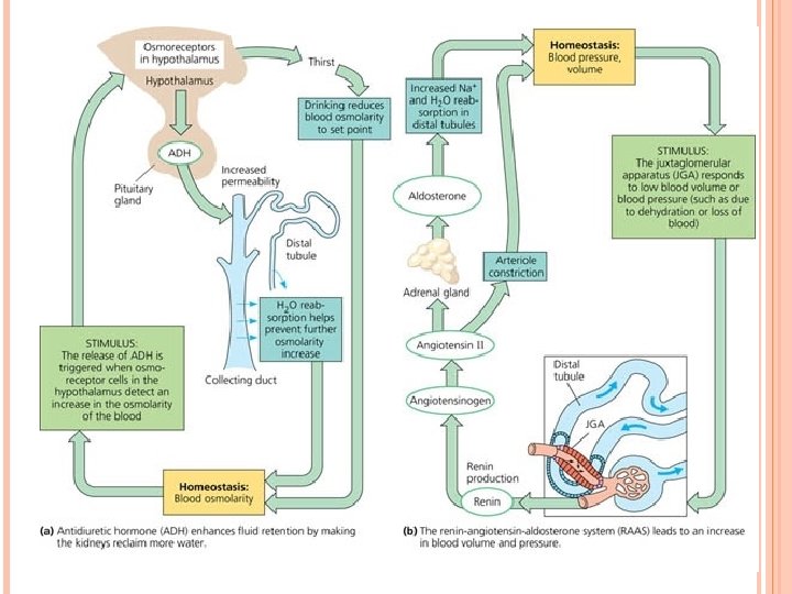 It is done by hormonal feedback mechanisms involving the hypothalamus. Changes in blood volume, body fluid volume and ionic concentration activate Osmoreceptors. Regulation by ADH/ (vasopressin): - When body fluid level decreases, the osmoreceptors stimulate the hypothalamus to release antidiuretic hormone. ADH facilitate water reabsorptionfrom latter parts of tubule and prevents diuresis.