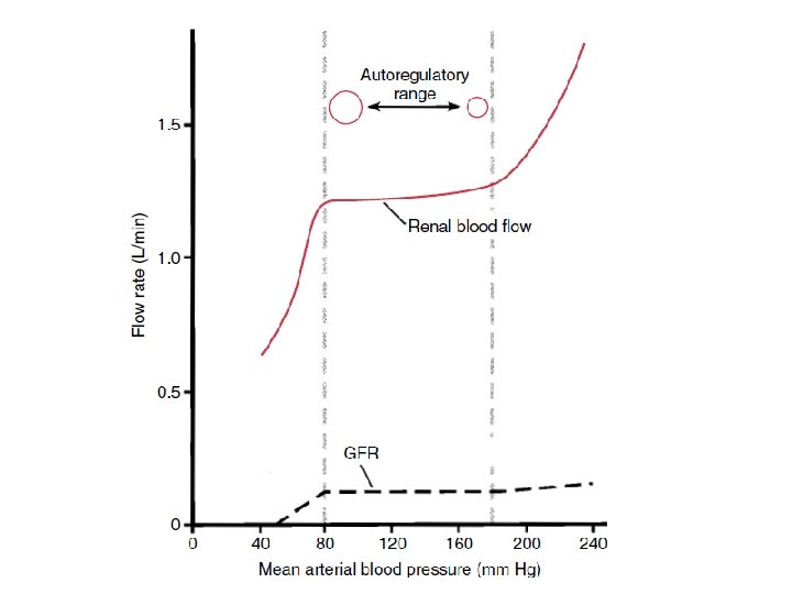 Renal Blood Flow Control (cont. ): • Renal autoregulation mechanism maintains renal blood flow and GFR relatively constant over an arterial blood pressure range of 80 -170 mm. Hg. • Autoregulation is an intrinsic property of the kidneys and is observed in an isolated perfused kidney devoid of external nerves. • Although all renal arterioles are richly innervated by sympathetic nerves, reflex sympathetic stimulation has an unimportant role in long-term control of renal blood flow. Sympathetic stimulation is important in reducing GFR during severe disturbances (e. g. severe hemorrhage). The same concept is applied to plasma levels of adrenaline and noradrenaline (released from adrenal medulla). • Local release of Nitric Oxide (NO) and prostaglandins and bradykinin may damper the renal vasoconstrictor effects of the sympathetic nerves and angiotensin II (as seen in chronic heart failure), especially their effects to constrict the afferent arterioles. • Administration of NSAIDs in chronic heart failure can cause acute renal failure by negating the renal protective effects of the renal prostaglandins.