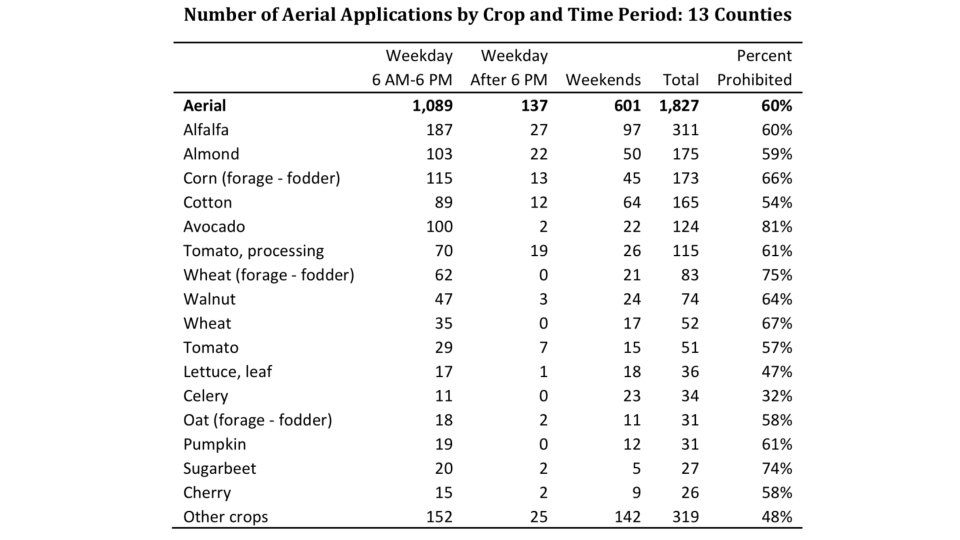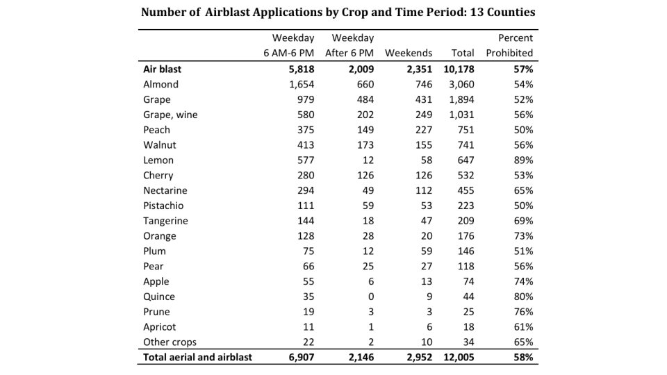 Parsing PUR data • PUR has two options for application type: aerial and ground • Cannot distinguish airblast from other ground based application types • UCCE: safe to assume airblast for tree & grape crops (insecticide & fungicides). • Under the regulation, growers must apply fungicides at night or weekends