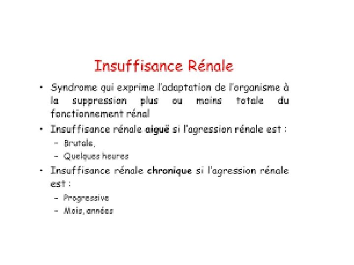 Rappels - Epidémiologie • Lésion rénale ou GFR < 60 ml/mn/1, 73 m 2 • IRA si >3 mois IRC si < 3 mois • Prévalence de l’insuffisance rénale: 15% des patients hospitalisés 50% des patients en unité de soins intensifs 2 situations : • patient «e tiquete » insuffisant re nal = facile • patient non connu comme insuffisant re nal = difficile - dégradation progressive de la FR des sujets a ge s - FR normale mais pathologie aigue : de shydratation, hypovole mie, fièvre, bas de bit, . . .