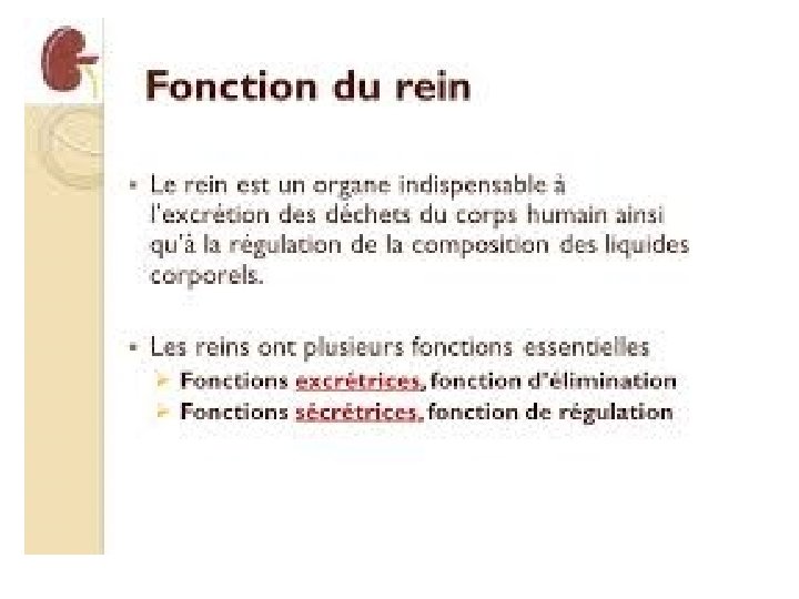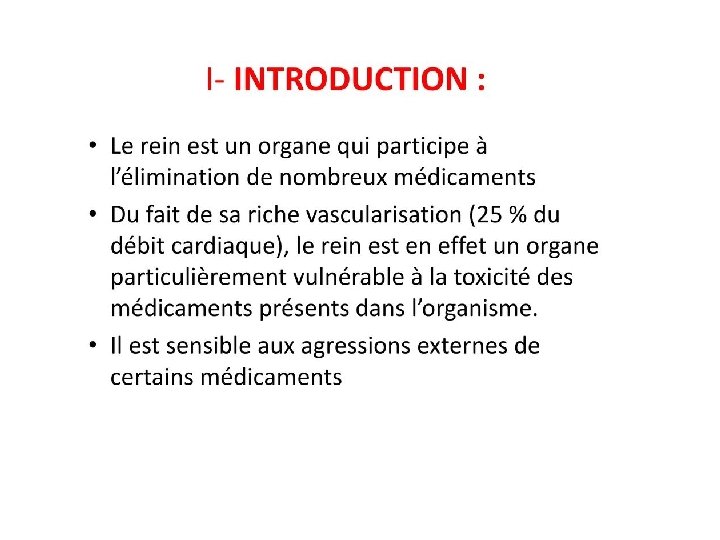 INTRODUCTION • Le médecin est obsédé par le risque de néphrotoxicité et d’accumulation des molécules normalement éliminées par le rein • Cette obsession est pleinement justifiée, tant le rein joue un rôle important dans l’élimination de nombreux médicaments.