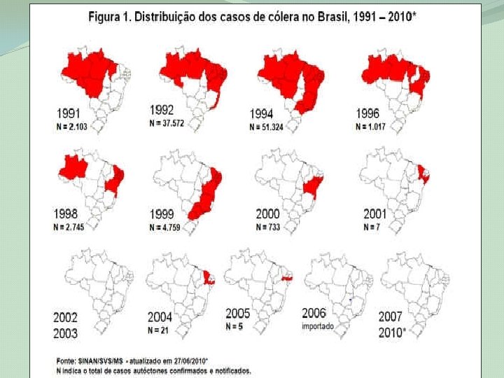 CÓLERA � Vibrio cholarae �Transmissão – água contaminada. �Sintomas – diarréia, fezes esbranquiçadas, vômitos, cólicas intestinais, cãibras musculares, alterações na produção de urina. �Prevenção – ingerir água tratada, fervida ou clorada; proteger os alimentos, inclusive os cozidos; evitar consumo de alimentos preparados em locais de higiene duvidosa; cuidados higiênicos pessoais; lavar bem frutas, verduras; comer frutos do mar bem cozidos.