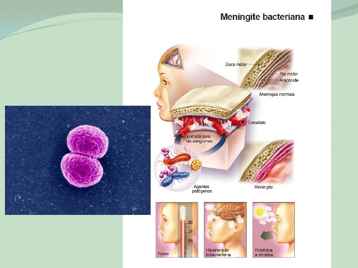 Meningite meningocócica �Neisseria meningitidis �Processo de inflamação das meninges causada pela bactéria. �Transmissão – contato das vias respiratórias por gotículas de saliva expelida por espirros, tosse ou fala; ou pelo contato de objetos contaminados. �Sintomas – dores de cabeça e garganta, febre alta e rigidez na nuca. �Tratamento e Prevenção – antibióticos; vacina específica.