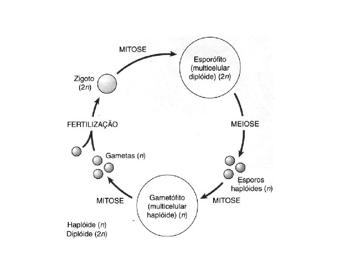 Todas as plantas são seres haplodiplobiontes, por isso reproduzemse por metagênese ou alternância de gerações. Fase esporofítica (2 n) sofre R!(meiose)e produz ou esporófito cresce e forma o E! esporos(n) crescem e formam a E! (mitoses) fase sexuada do ciclo fase assexuada do ciclo Fase gametofítica (n) ou gametófito E! Zigoto (2 n) se unem e formam o fecundação produz gametas (n)