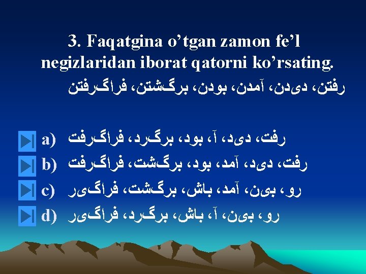2. Fors tilida fe’l negizlari nechta? a) 2 ta b) 3 ta c) 4 ta d) 5 ta