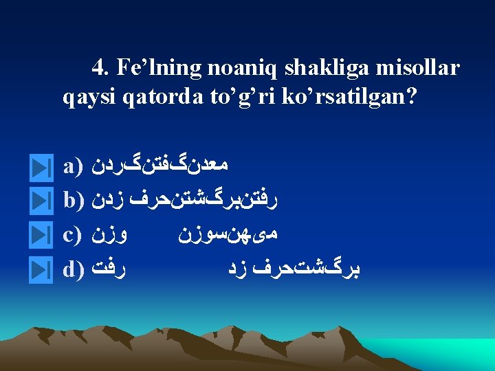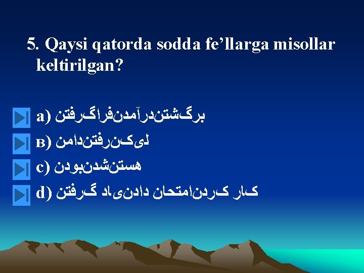 7. So’zlarning to’g’ri tarjima qatorini toping: ﺩیﺪﻥ ، کﺮﺩﻥ ، ﺗﻤﺎﻡ ﺷﺪﻥ ، ﺩﺍﺧﻞ ﺷﺪﻥ ، ﺑﺮﺩﺍﺷﺘﻦ a) ko’tarmoq, kirmoq, tamom bo’lmoq, qilmoq, ko’rmoq b) ko’tarmoq, kirmoq, o’ylamoq, ovqatlanmoq, tamom bo’lmoq c) Ishlamoq, ko’rishmoq, ko’tarmoq, kirmoq, tamom bo’lmoq d) ko’rishmoq, ko’tarmoq, kirmoq, tamom bo’lmoq, aylanmoq