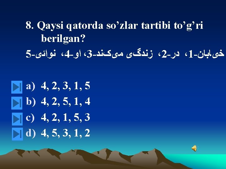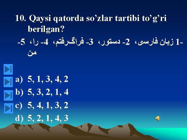9. Qaysi qatorda so’zlar tartibi to’g’ri berilgan? ﺑﻪ -5 ، ﻧﺮﻓﺘیﻢ -4 ، ﺩیﺮﻭﺯ -3 ، ﻣﺎ -2 ، ﺳیﻨﻤﺎ 1 - a) b) c) d) 3, 4, 5, 1, 2 3, 2, 5, 1, 4 3, 5, 2, 4, 1 3, 4, 2, 5, 1