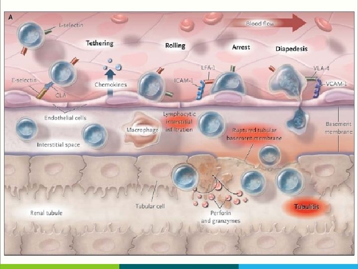 T-Cell Movement in The Allograft § T cells use adhesion molecules, including leukocyte-function–associated antigen 1 (LFA 1) to roll along and tether to endothelium, migrate across peritubular capillaries, and enter the graft § Fingolimod, a small molecule that blocks the egress of T cells from lymph nodes, and anti–LFA-1 agents block such T-cell movement, but until now they have had a limited clinical effect in transplantation