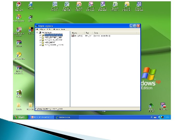Geneza rejestru cd. I tak w wersji Windows 95 po raz pierwszy zaistniał REJESTR jako centralna baza danych. Instalowane urządzenia (wraz ze swoimi sterownikami w postaci plików inf ) oraz aplikacje umieszczały w nim swoje adnotacje. Jego budowa przypominała budowę plików ini – sekcjom odpowiadały klucze, wpisom – wartości. Ich nazwy nie były już ograniczone do 8 znaków. Pozwoliło to znacznie łatwiej wykrywać problemy i odszukiwać informacje. Wprowadzenie rejestru nie było jednak równoznaczne z pozbyciem się plików ini. Powodem tego było zachowanie zgodności z aplikacjami 16 -bitowymi przeznaczonymi dla środowiska MS-DOS i Windows 3. x. W systemie Windows XP Professional PL rejestr składa się z plików sam. dat, security. dat, software. dat, system. dat, default. dat umieszczonych w katalogu c: WindowsSystem 32Config oraz w pliku ntuser. dat umieszczonego w katalogu profilu danego użytkownika.