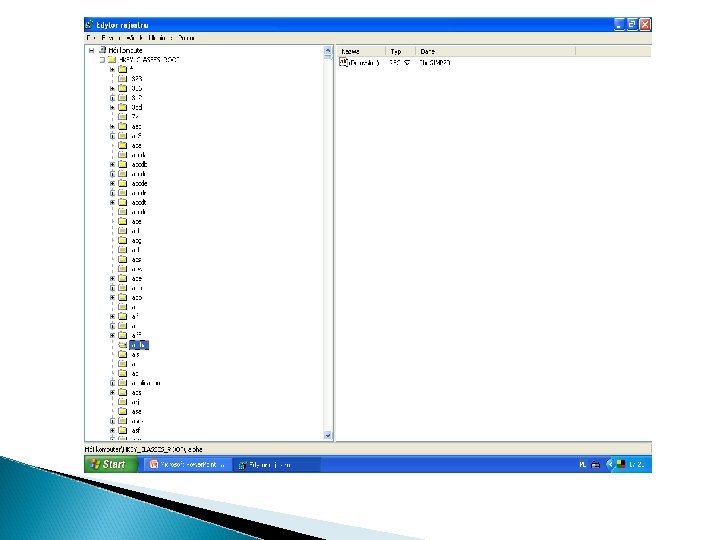 Główne gałęzie rejestru: HKEY_CLASSES_ROOT – klasy obiektów Jest to jedyna gałąź w rejestrze zachowana ze względu na zgodność z rejestrem Windows 3. x. przechowywane są w niej skojarzenia typów plików według ich rozszerzeń>>>