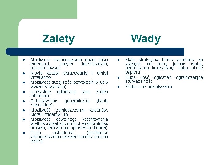 Zalety l l l l Możliwość zamieszczania dużej ilości informacji, danych technicznych, teleadresowych Niskie koszty opracowania i emisji przekazów Możliwość dużej ilości powtórzeń (5 lub 6 wydań w tygodniu) Korzystnie odbierana jako źródło informacji Selektywność geograficzna (tytuły regionalne) Możliwość zamieszczania kuponów, ulotek, folderów, itp. . Możliwość dowolnego kształtowania wielkości przekazu (moduł, wielokrotność modułu, cała strona, ogłoszenia drobne) Duża aktualność (możliwość zamieszczania ogłoszeń nawet z dnia na dzień) Wady l l l Mało atrakcyjna forma przekazu ze względu na niską jakość druku, ograniczoną kolorystykę, słabą jakość papieru Duża ilość ogłoszeń ograniczająca zauważalność Krótki czas odziaływania
