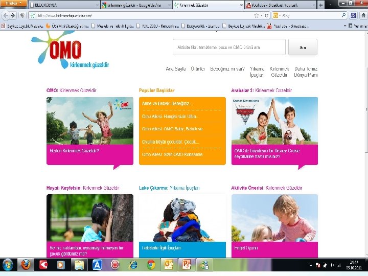 Hedef kitle: 20 -35 yaş arasında alışverişini kendi yapan, çocuk sahibi ev hanımı, B, C SES grubu Önerme: Kirlenmek öğrenmektir, eğlenmektir, hayatı keşfetmektir. Vaat: 40 Yıldır piyasada. En iyi temizlik ve en mükemmel beyazlık. Ürünler: Omo baby – Omo Energy