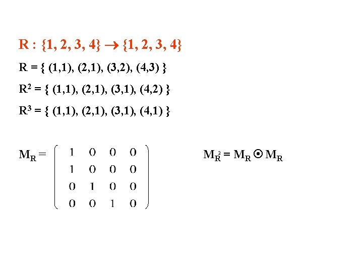 Contoh: R : {1, 2, 3, 4} R = { (1, 1), (2, 1), (3, 2), (4, 3) } R 2 = { (1, 1), (2, 1), (3, 1), (4, 2) } R 3 = { (1, 1), (2, 1), (3, 1), (4, 1) } R 4 = { (1, 1), (2, 1), (3, 1), (4, 1) } R 5 = { (1, 1), (2, 1), (3, 1), (4, 1) } dst Soal: Verifikasi dengan gambar