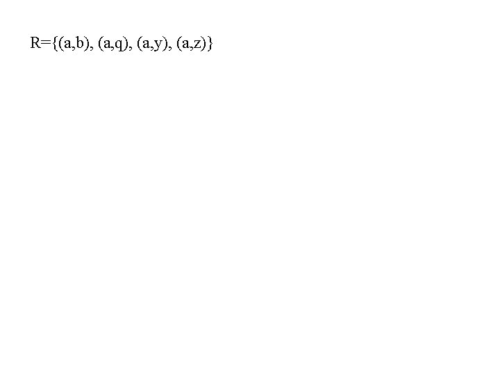 Contoh: A = { a, p, x }; B = { b, q, y, z }, Ax. B={(a, b), (a, y), (a, q), (a, z), (p, b), …} , R 1={(a, z), (p, y), (p, b)} R = { (a, b), (p, q), (x, y), (x, z) } (a, b) R atau a R b (a, q) R atau a R q Relasi R dlm bentuk pemetaan b a q p y x z Relasi R dlm bentuk matriks b q y z a 1 0 0 0 p 0 1 0 0 x 0 0 1 1