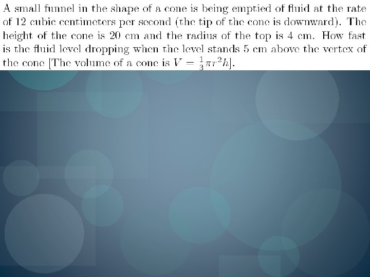 �Water pours into a conical tank of height 10 ft and radius 4 ft at a rate of 10 ft 3/min. How fast is the water level rising when it is 5 ft. high? As time passes, what happens to the rate at which the water level rises? Explain. Need to get rid of the variable r some how, can we rewrite r in terms of h? We can if we use similar triangles.