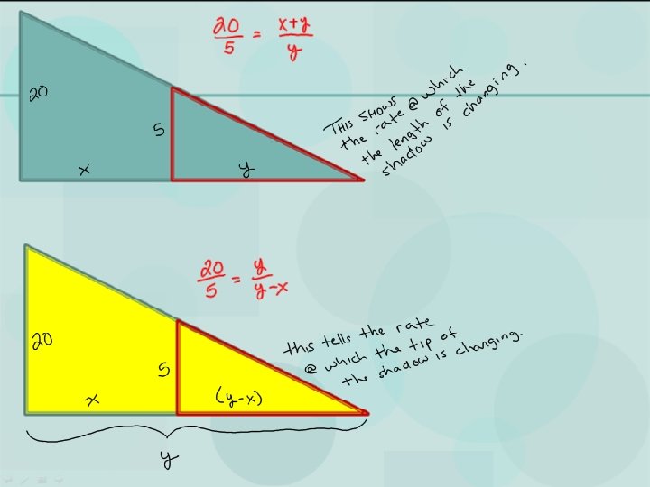 � A 5 -foot girl is walking toward a 20 -foot lamppost at a rate of 6 feet per second. How fast is the tip of her shadow (cast by the lamppost) moving? � Let x(t) be the distance of the girl to the base of the post, and let y(t) be the distance of the tip of the shadow to the base of the post. If you've drawn the right setup, you should see similar triangles. . . this question involves asking how fast the tip of her shadow is moving so we think about the distance between her and the tip of the shadow (y-x) � If it asks how fast is the length of the shadow moving, now we have to think about the distance from the light pole to the tip of the shadow (y+x).