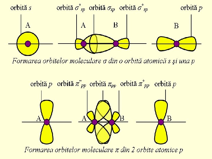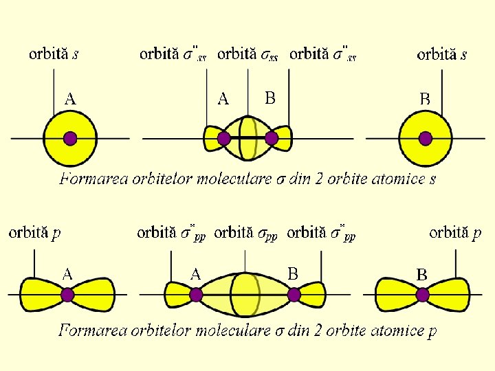 Completarea cu electroni a orbitelor moleculare - moleculele diatomice homonucleare ale elementelor din perioada a 2 -a Orbitele moleculare cu energie de mai înaltă se numesc orbite de legătură (σss, σsp, σpp, πpp) şi orbitele moleculare cu energie mai joasă se numesc orbite de antilegătură (σ*ss, σ*sp, σ*pp, π*pp)