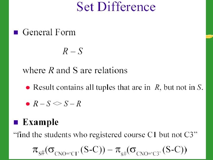 QUERY Q 6 (Q 6) Find the names of Sailors who have reserved a red and a green boat. It seems tempting to use the expression used in Q 5, replacing simply ∪ by ∩. However, this won’t work, for such an expression is requesting the names of sailors who have requested a boat that is both red and green! The correct expression is as follows: (Tempred, sid((σcolor=‘red’Boats) ⋈ Reserves)) (Tempgreen, sid((σcolor=‘green’Boats) ⋈ Reserves)) sname ((Tempred ∩ Tempgreen) ⋈ Sailors)