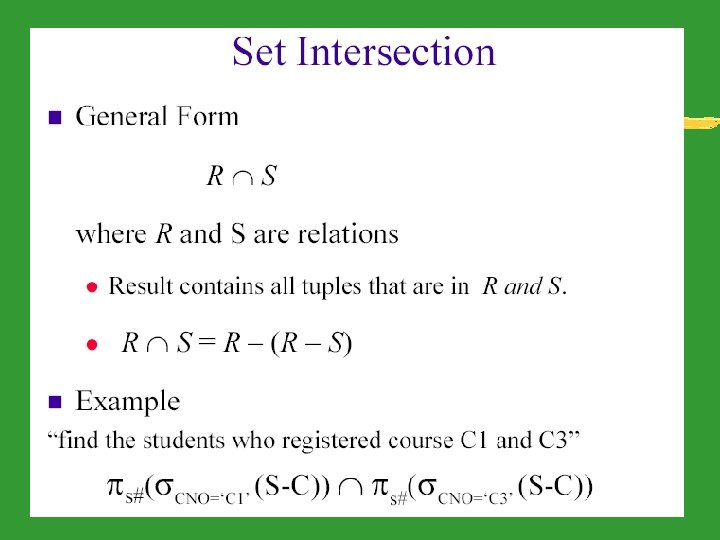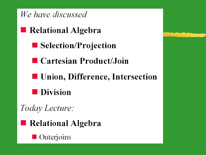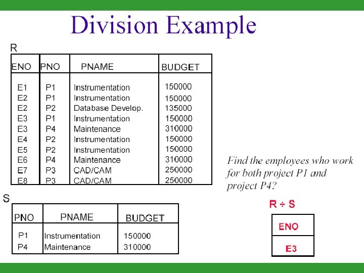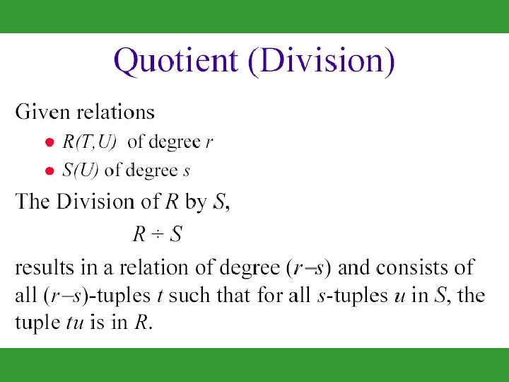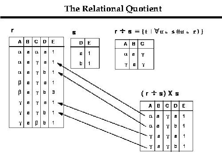 Division (Cont’d) z. Division is an operation on schema R – S z. A tuple t is in r s if and only if: zt is in ΠR – S(r) and z. For every tuple ts in s, there is a tuple tr in r satisfying both of the following: a. tr[S] = ts[R] b. tr[R – S] = t