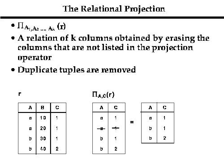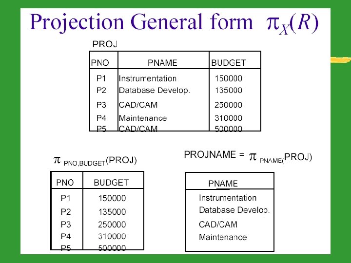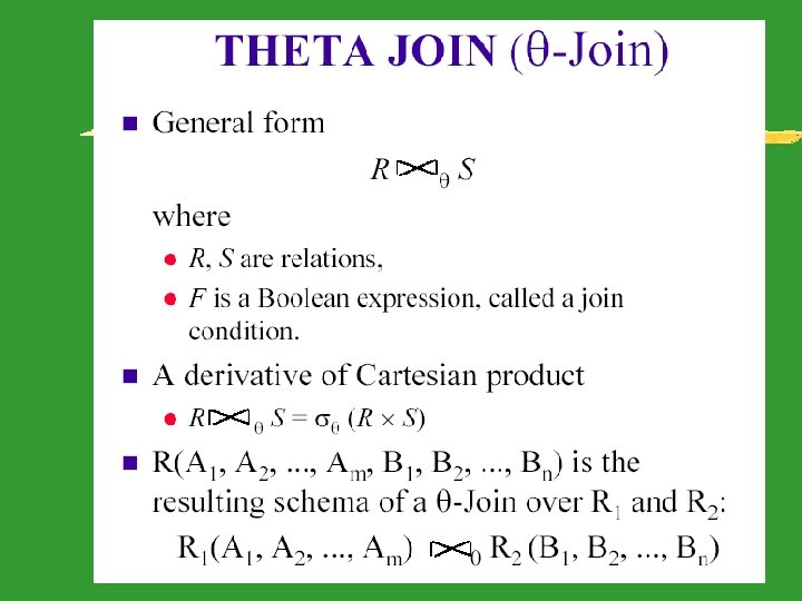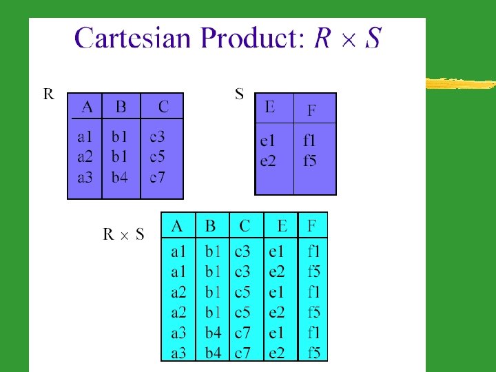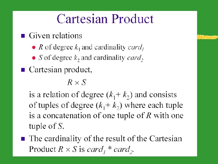 Cartesian Product z. R(A 1, A 2, . . . , Am) and S(B 1, B 2, . . . , Bn) z. T(A 1, A 2, . . . , Am, B 1, B 2, . . . , Bn) = R(A 1, A 2, . . . , Am) X S(B 1, B 2, . . . , Bn) z. A tuple t is in T if and only if t[A 1, A 2, . . . , Am] is in R and t[B 1, B 2, . . . , Bn] is in S. - If R has N 1 tuples and S has N 2 tuples, then T will have N 1*N 2 tuples.