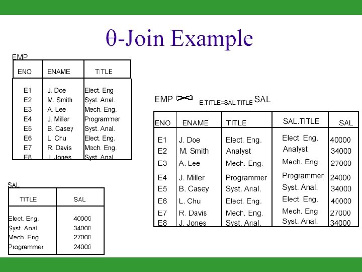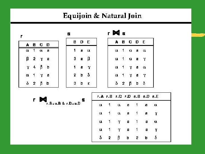 Equijoin: Special case of the condition join where the join condition consists solely of equalities between two fields in R and S connected by the logical AND operator (∧). Example: Given the two sample relational instances S 1 and R 1 The operator S 1 R. sid=Ssid R 1 yields