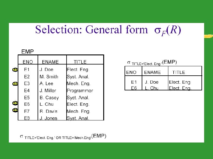 Select s balance>=1500 account eg: result : ac# owner ss# balance 2 sue 456 2000 3 jane 789 3000 Project eg: π result: owner, ss# account owner bob sue jane ss# 123 456 789