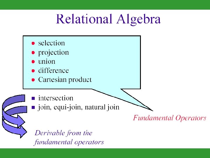 Relational Algebra Fundamental operators z select z project z cartesian product z union z set difference s p - Other operators z natural join z set intersection z division JOIN (butterfly symbol)