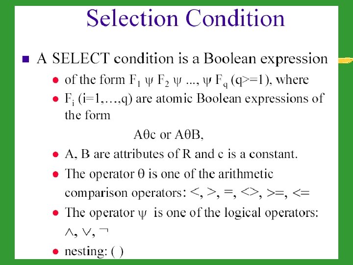 JOIN OPERATORS Condition Joins: - Defined as a cross-product followed by a selection: R ⋈c S = σc(R S) (⋈ is called the bow-tie) where c is the condition. - Example: Given the sample relational instances S 1 and R 1 The condition join S ⋈S 1. sid<R 1. sid R 1 yields