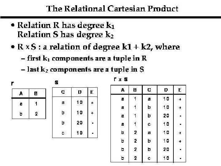 Cartesian Product R A a 1 a 2 Rx S B 2 4 S A B C D E a 1 2 4 d 1 e 1 a 1 2 3 d 2 e 1 C D E a 1 2 5 d 3 e 2 4 d 1 e 1 a 2 4 4 d 1 e 1 3 d 2 e 1 a 2 4 3 d 2 e 1 5 d 3 e 2 a 2 4 5 d 3 e 2