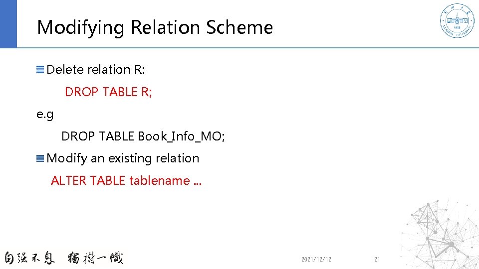 Modifying Relation Scheme Delete relation R: DROP TABLE R; e. g DROP TABLE Book_Info_MO; Modify an existing relation ALTER TABLE tablename. . . 2021/12/12 21