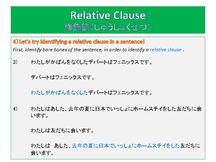 Relative Clause 修飾節(しゅうしょくせつ) 3)Let’s try forming a sentence in which a relative clause is used! 1) Mr Tanaka is the person who is drinking wine. 田中さんは 人です。 (←Bare bones of the sentence. ) ワインをのんでいる 2) The bus which goes to Newcastle University is No. 21. ______ バスは 21ばんです。 ニューキャッスル大学に行く 3) This is the book that my friend gave me. これは、 本です。 友だちがくれた 4) My younger brother lost the CD that I had borrowed from my friend. おとうとは CDを なくしました。 わたしが友だちから借りた