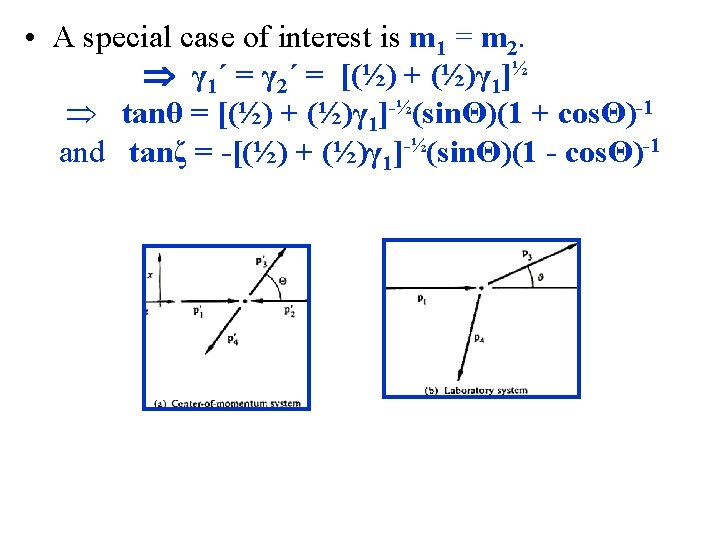 • Similarly for m 2: • Final Lab frame Momentum of m 2 (see figure): p 4 x = γ 2´[p 4 x´ + (β 2´/c)E 2´] • Algebra (combining a number of previous eqtns) gives: p 4 x = m 2 c(γ 2´)2β 2´(1 - cosΘ) (c) p 4 y = -m 2 cγ 2´β 2´sinΘ (d) • From (c) & (d), get the lab frame recoil angle ζ: tanζ = (p 4 y/p 4 x) = [(γ 2´)-1 sinΘ][1 - cosΘ]-1 • Similarly, we get