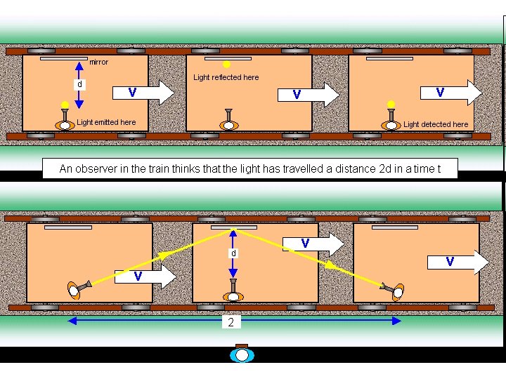 The relativity of simultaneity Speed v A person on a fast-moving train sends two light signals from the exact centre of the train carriage to two detectors at opposite ends. They appear to arrive simultaneously. But what does an observer by the trackside see? You. Tube video