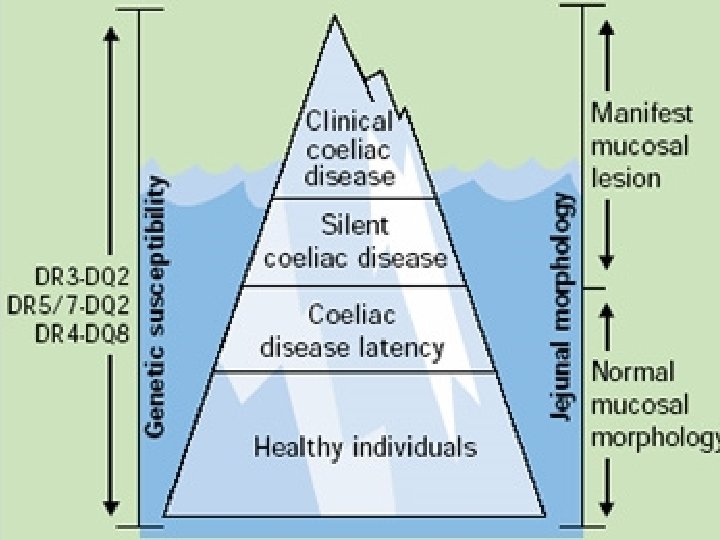 FISIOPATOGENIA -Na população, 25% a 30% de indivíduos que apresentam perfil genético relacionado à DC , apenas 1% desenvolverá a doença ao ingerir glúten. - Algumas pessoas irão desenvolver a doença nos primeiros meses após o início do consumo do glúten e outras apenas após vários anos. - É possível que outros fatores relacionados ao meio ambiente, e não apenas a ingestão do glúten influenciem a evolução do quadro ( idade do desmame, exposição precoce do sistema imunológico à gliadina, enteroinfecções, parasitoses intestinais).