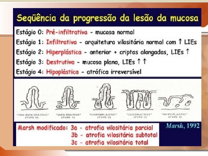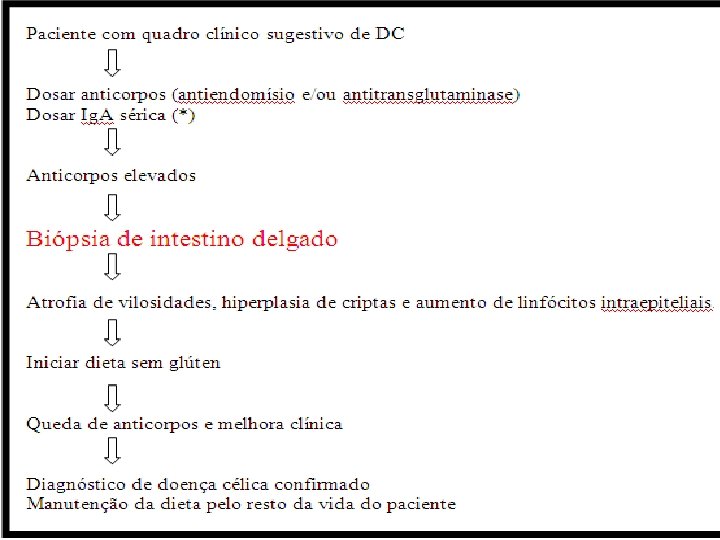 DIAGNÓSTICO -Manifestações clínicas -Exames inespecíficos: Hmg; TAP; íons; provas de avaliação da absorção intestinal (teste de tolerância à lactose, dosagem de gordura fecal) -Exames específicos: * testes sorológicos: Ac. antigliadina, Ac. Antiendomísio, Ac. antitransglutaminase. * biópsia de intestino delgado (Padrão Ouro) – atrofia de vilosidades, alongamento das criptas e aumento dos Linfócitos intra-epiteliais(LIE).