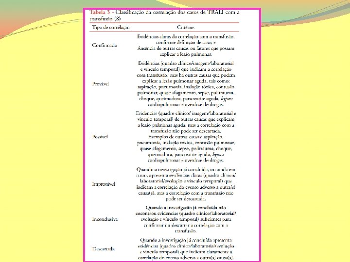 Lesão pulmonar aguda relacionada à transfusão (TRALI): revisão da literatura PDF]Lesão pulmonar aguda relacionada à transfusão (TRALI): revisão da. . . rmmg. org/exportar-pdf/2218/v 27 n 1 a 10. pdf. Artigo Livre! Carolina Teixeira Rodrigues 1, Lorena Machado Marques 1, José Roberto Faria 2 Os critérios de diagnóstico da TRALI foram definidos após consenso realizado em 2004 (Consensus Conference Committee in Toronto) e classifcados como: 1) suspeita de TRALI; 2) possível TRALI e 3) TRALI tardia (Tabela)