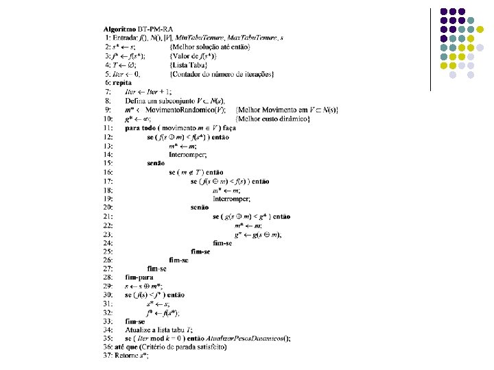 Relaxação Adaptativa l l O algoritmo apresentado a seguir aplica Busca Tabu com Relaxação Adaptativa Fonte: l Marinho, E. H. Heurísticas Busca Tabu para o Problema de Programação de Tripulações de Ônibus Urbano. Dissertação de mestrado, Programa de pósgraduação em Computação, Universidade Federal Fluminense, 2005. Disponível em http: //www. decom. ufop. br/prof/marcone/Orientacoes/d iss. Euler. Final. pdf.