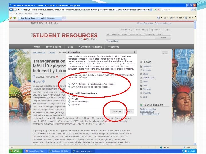 Today’s Goals: �I can identify the difference between primary and secondary resources. �I can identify the difference between databases and the Internet. �I can find and evaluate resources to determine if they are reliable. �I can create a research paper utilizing APA format with citation. �I can locate, access, and utilize Grove City High School’s online databases.