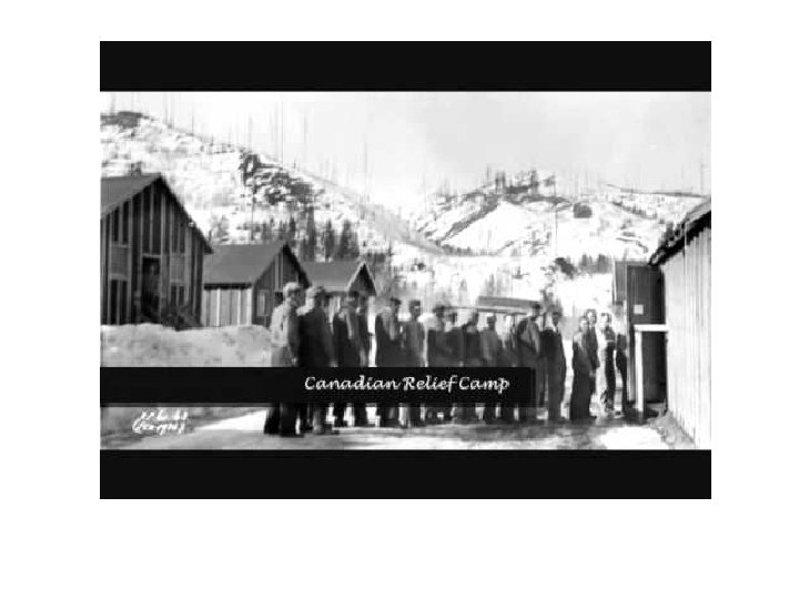Relief Camps • arose out of concern for large numbers of homeless, jobless single men who did not qualify for relief under the 2 nd Relief Act • BC government establishes camps in rural areas (away from cities) • Federal government takes over camps and expands them across Canada – run by Dept of Nat’l Defence