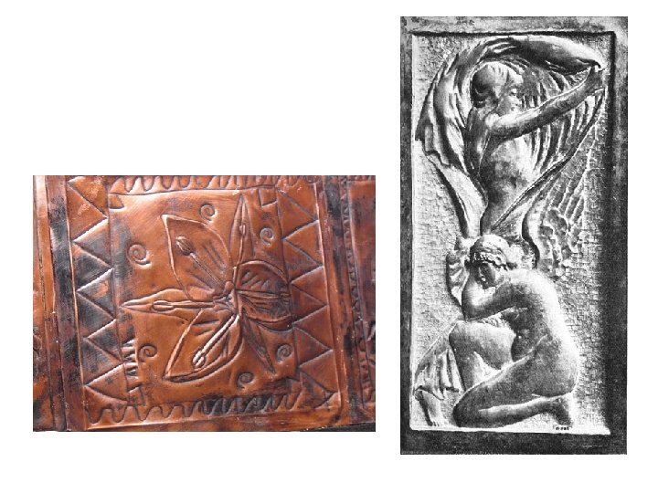 Repousse: a type of relief sculpture in metal. • Relief sculpture: parts of a panel are raised from a flat plane or surface. – Bas relief: low relief – Alto-relievo: High relief
