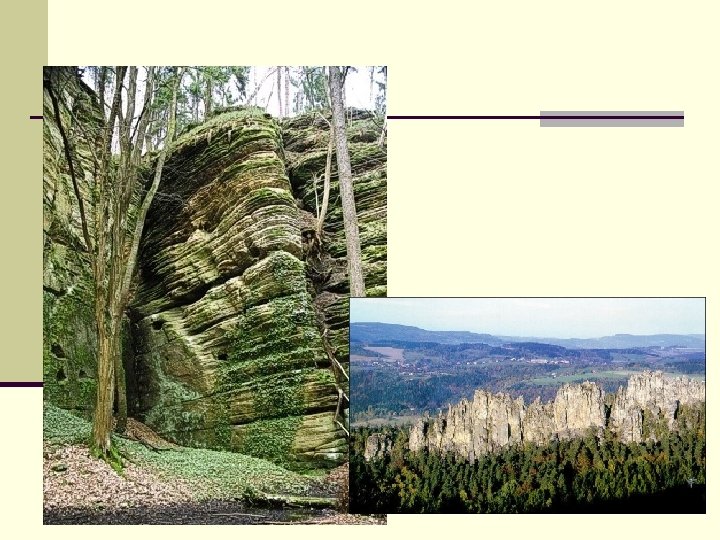 Jetřichovické stěny n n n pískovce středního turonu až coniaku vyvinutá kvádrová odlučnost hustá síť údolí a roklí charakteristické tvary selektivního zvětrávání třípatrová krajina: svrchní patro: stolové hory (relikty původní plošiny) + neovulkanické vrchy (480 m) střední: pískovcová skalní města spodní: síť soutěsek a údolí