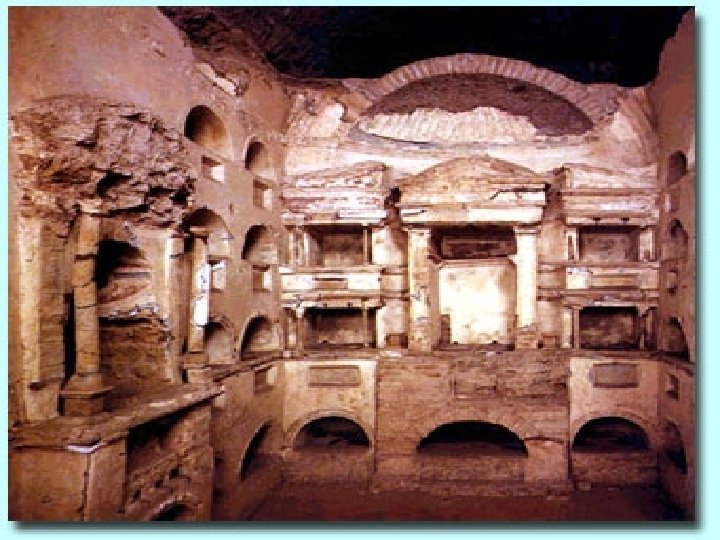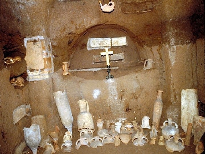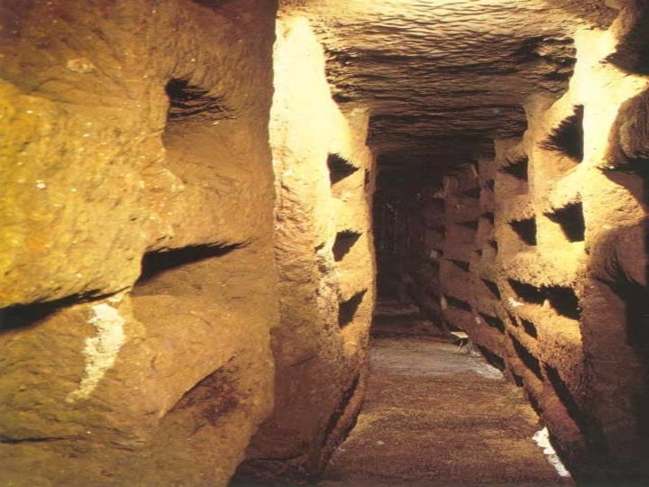 Sacred space- disposing of dead • Jews, Christians, Muslims bury dead in a cemetary- often doubles as a park • Early Christians worshipped and buried their dead in catacombs- underground passages. • Some Christians bury dead w/ feet toward Jerusalem • Egyptians buried dead on West side of river, lived on E. side