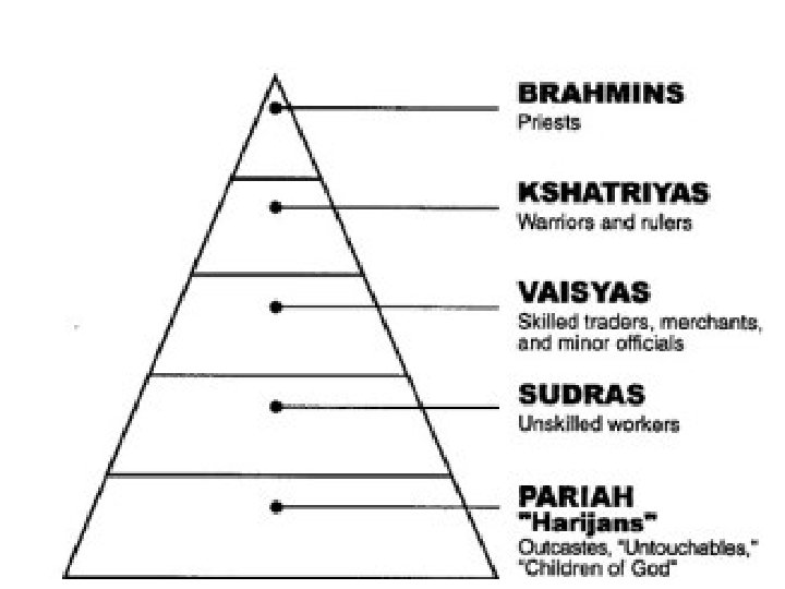 Central Beliefs • Many Gods all incarnations of one all-powerful God Vishnu • Caste System: levels of society all people are born into (reincarnation to go to next level) • Religion of India