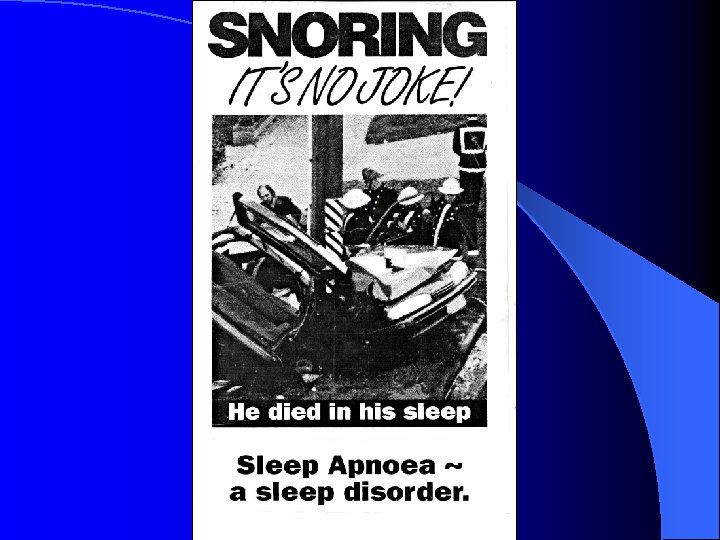 Consequences of Sleep Apnoea Medical consequences : - Hypertension Insulin Resistance Cardiac Arrhythmia Heart Attack Stroke Nocturnal GORD Nocturia Depression