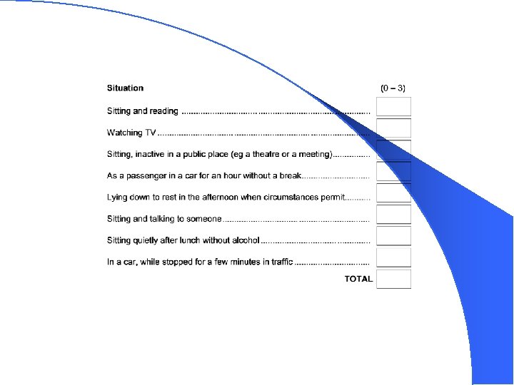 The Epworth Sleepiness Scale How likely are you to doze off or fall asleep in the following situations, in contrast to just feeling tired? This refers to your usual way of life in recent times. Even if you have not done some of these things recently, try to work out how they would have affected you. Use the following scale to choose the most appropriate number for each situation: 0 = would never doze 1 = slight chance of dozing 2 = moderate chance of dozing 3 = high chance of dozing It is important that you put a number (0 to 3) in each of the eight boxes.
